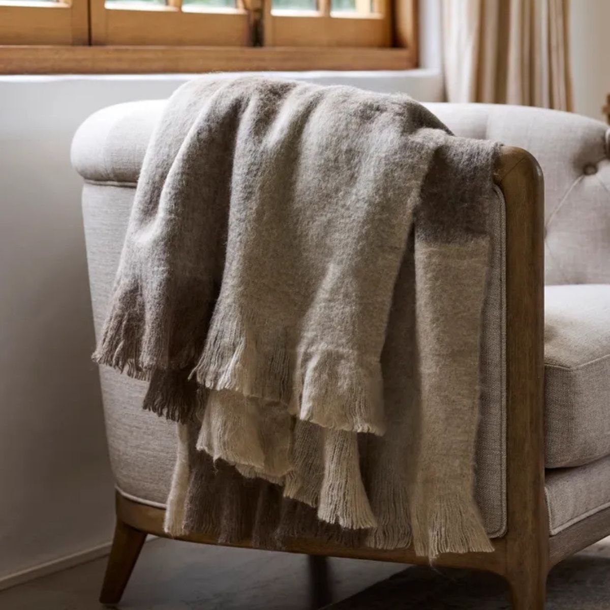 The Beige & Brown Plaid Fringe Throw combines cozy warmth with classic style. Made from a blend of 25% wool, 57% acrylic, and 17% nylon, this throw features a charming plaid pattern with tassel accents.