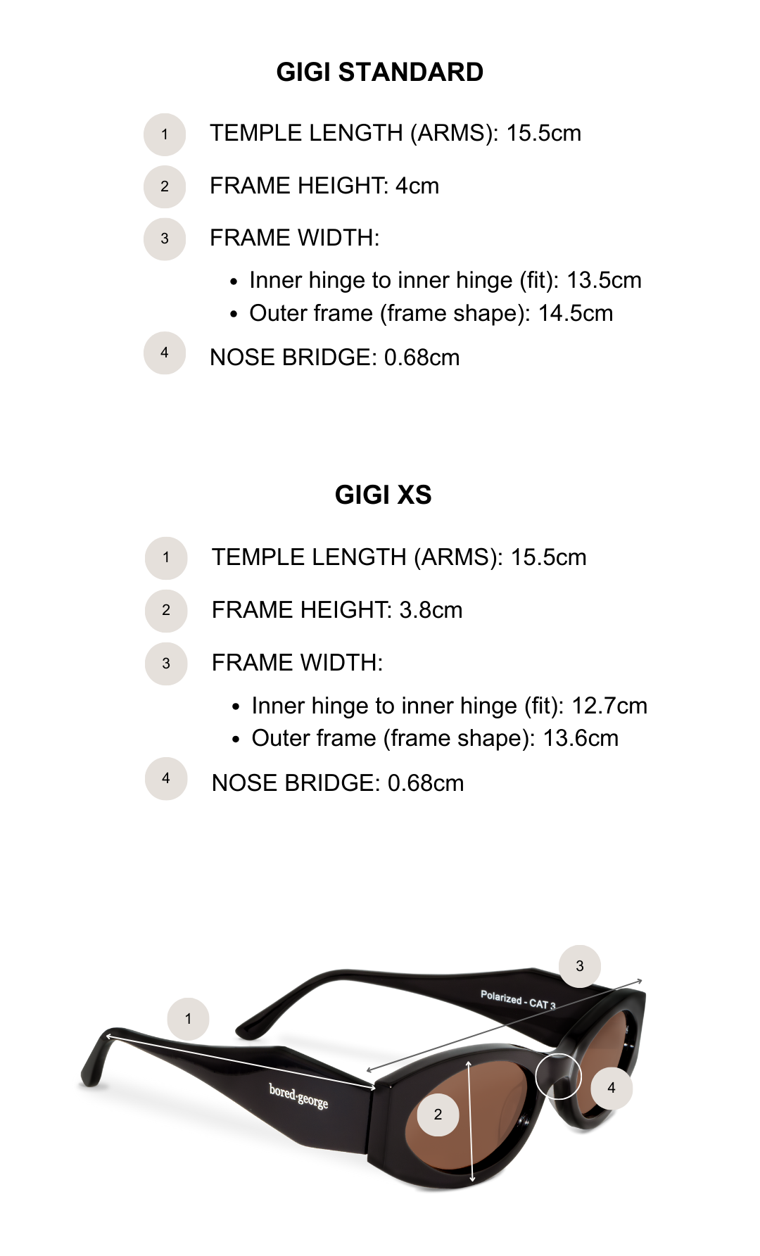 Meet NEW Gigi in XS sized frame- your new everyday staple sunglasses from Bored George. A sleek oval silhouette with a modern edge. These sunglasses feature a glossy black frame paired with warm brown lenses for effortless cool-girl energy. Lightweight yet bold, they strike the perfect balance between statement and wearability.