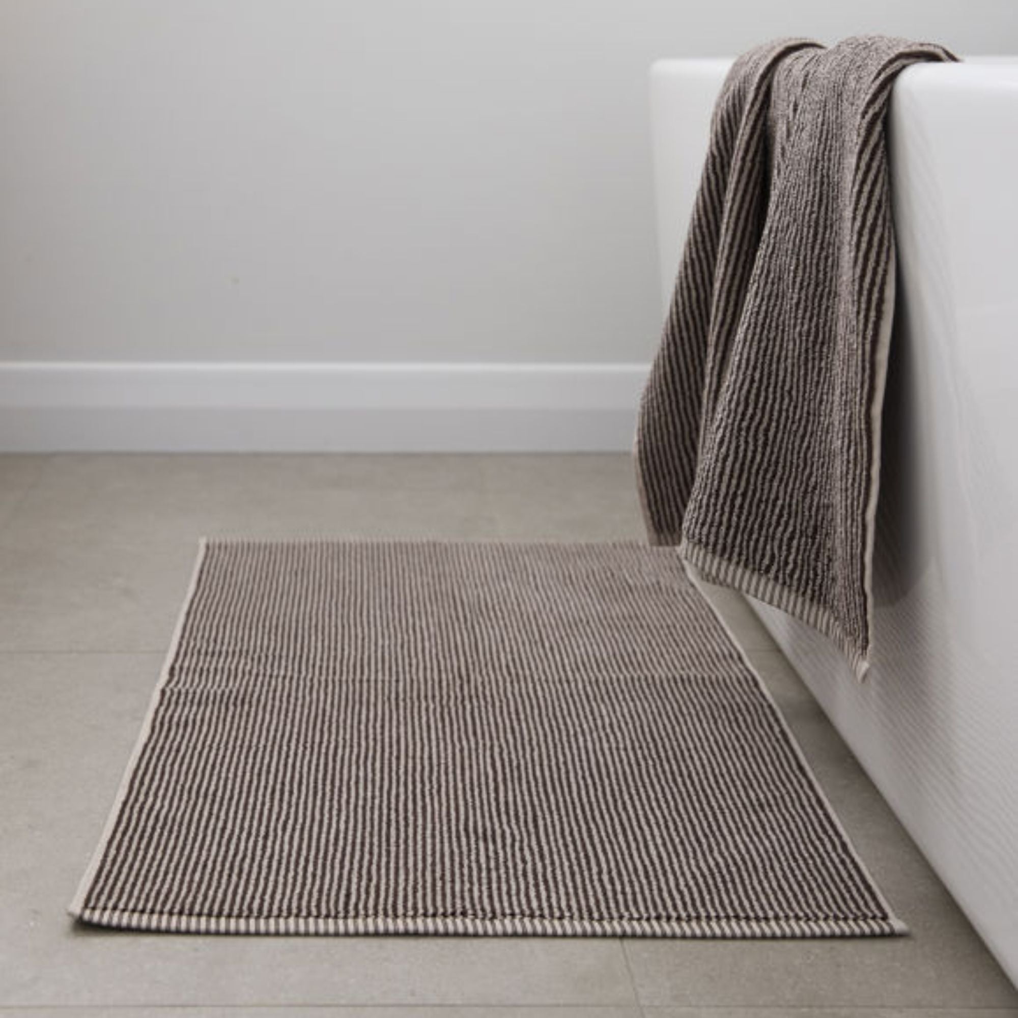 This cocoa/ bone striped cotton bath mat will look lovely in your bathroom, especially if you have the matching hand towel and face cloth! Made from 100% cotton. 55cm x 85cm