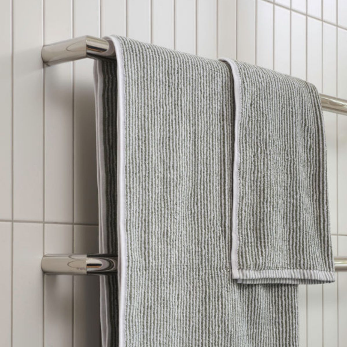 This olive/white striped cotton hand towel will look lovely in your bathroom, especially if you have the matching hand towel and face cloth! Made from 100% cotton. 45cm x 75cm