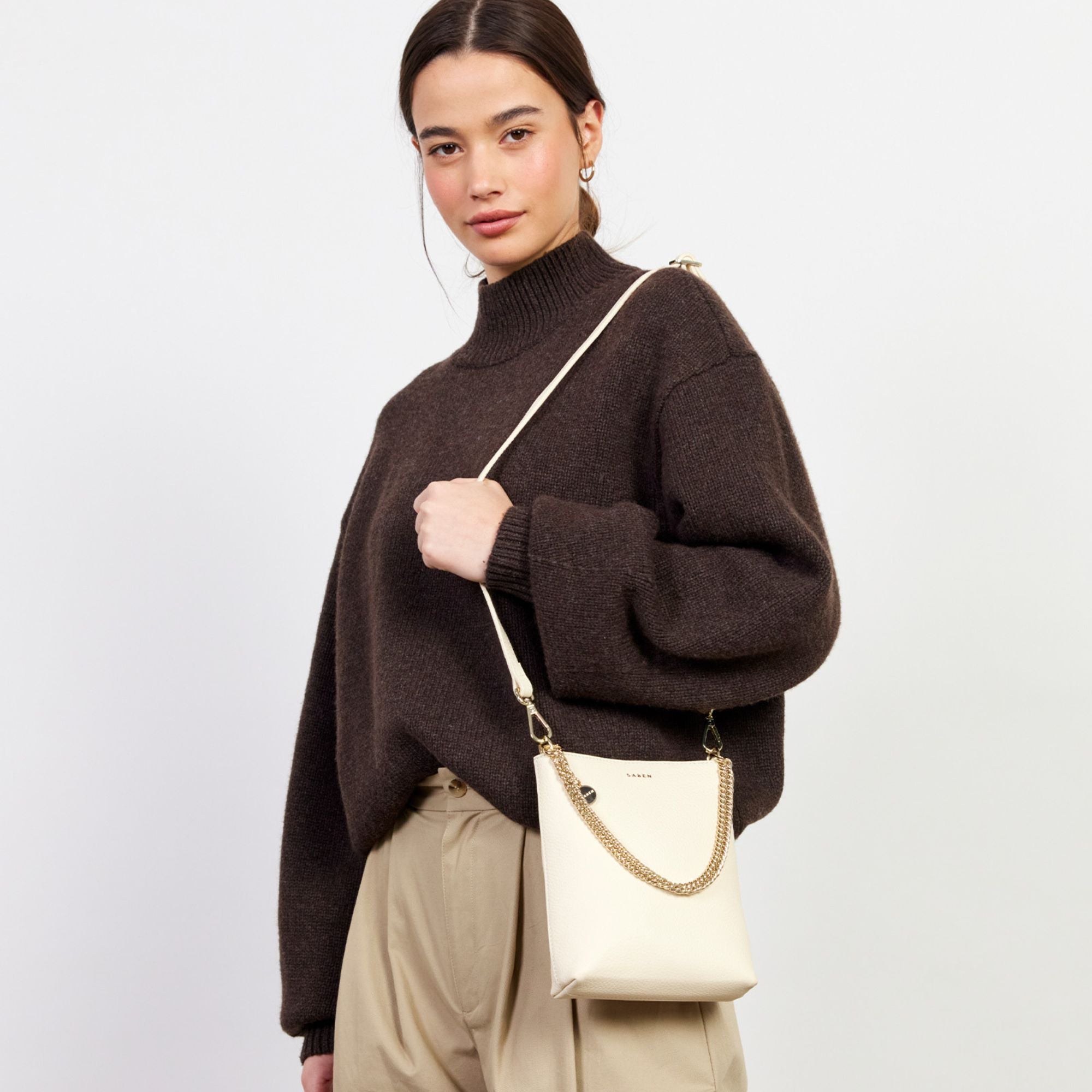 Meet Coco. SABEN’s must-have mini bag with extra sass. Big enough to hold your wallet and phone, but small enough to be elegant arm candy at your next event. She offers multiple ways to wear for handsfree dancing, or traversing the city. Coco's detachable chain detailing can be worn decoratively or used as a handle.