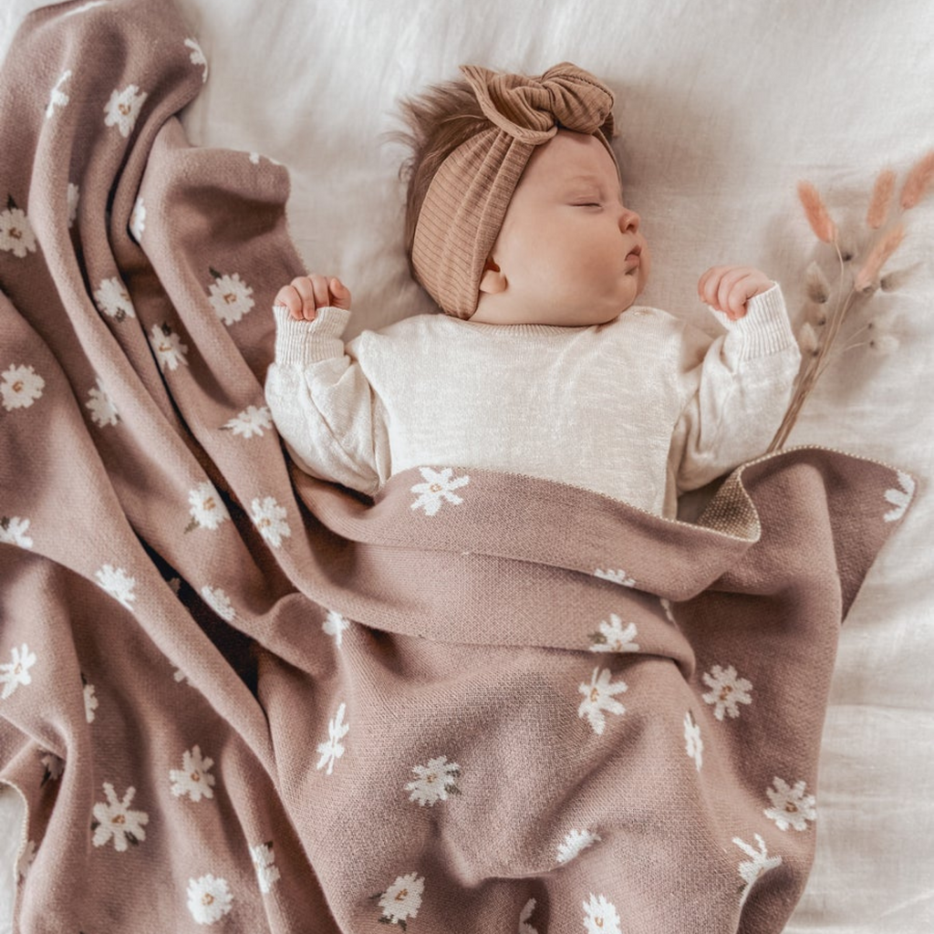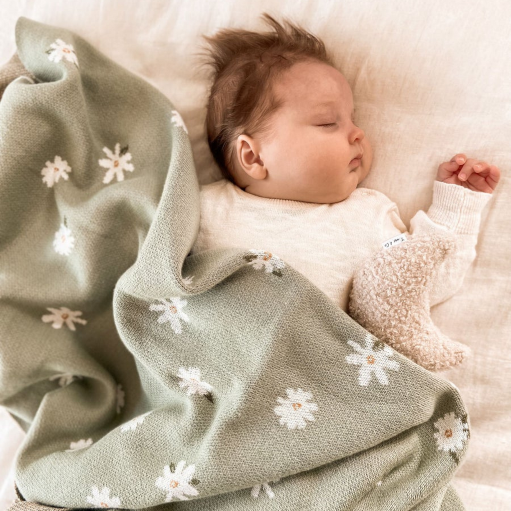 This daisy blanket is knitted from lovely, soft, GOTS certified organic cotton. Can be used as a layer in a cot, as a pram blanket or as nursery décor. 80cm x 100cm.