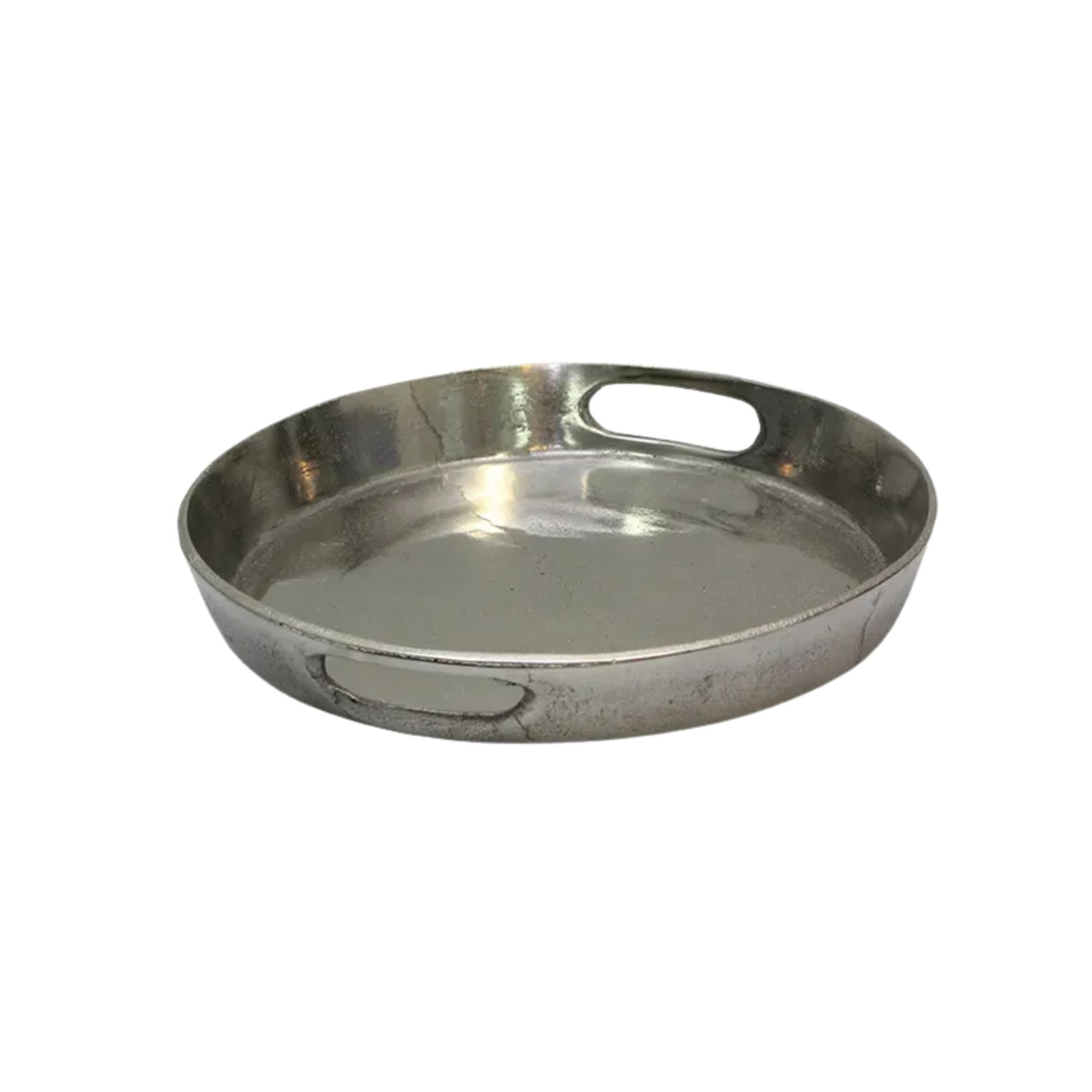 Classic round deep drinks tray by French Country with cut out handles crafted from nickel with an antique silver finish.