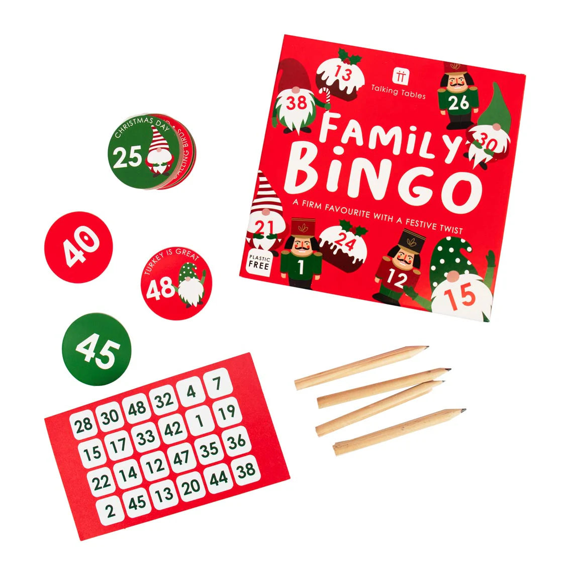Gather the whole family for some holiday cheer with this Christmas Family Bingo Game from Talking Tables! Covered in fun illustrations of nutcrackers, gnomes, and Christmas puddings against a vibrant red background, it adds a festive flair to the classic game. A joyful way to keep everyone entertained and smiling throughout the festive season.