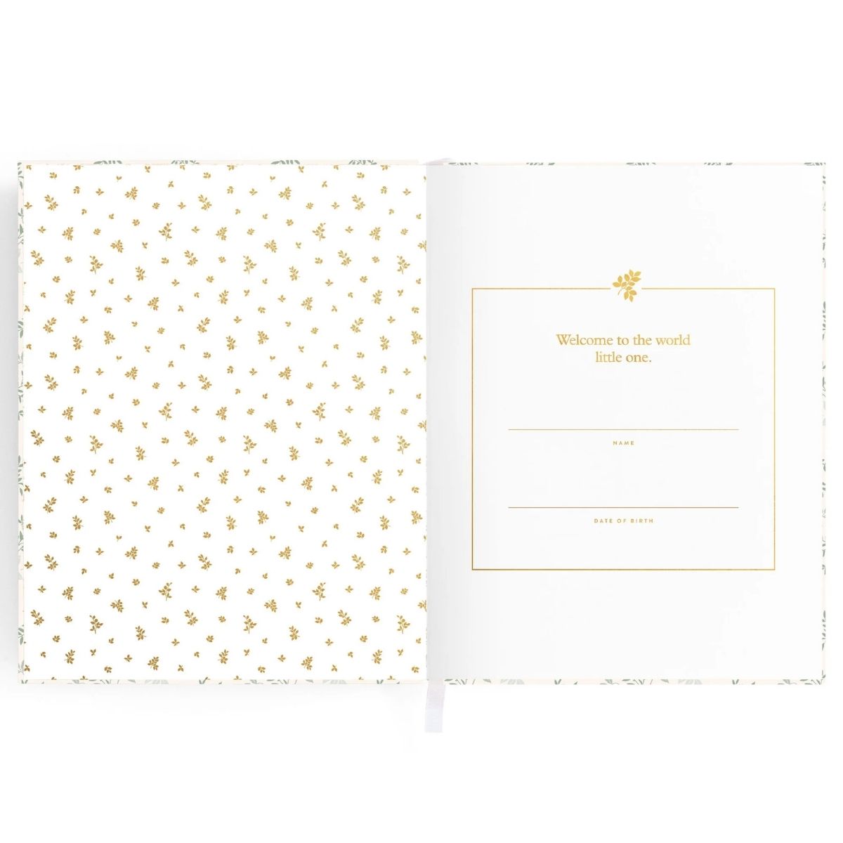 220 x 280 mm (15mm spine) / 8.6 x 11 inches (0.59 inch spine). Gold foil stamped printed linen cover. White grosgrain ribbon. 2mm foil stamped hard cover, lay-flat binding. Gold foil end pages and premium 115gsm FCS-certified acid-free paper. Packaged in a cello sleeve with gold foil bellyband. Designed in Australia, printed in China.