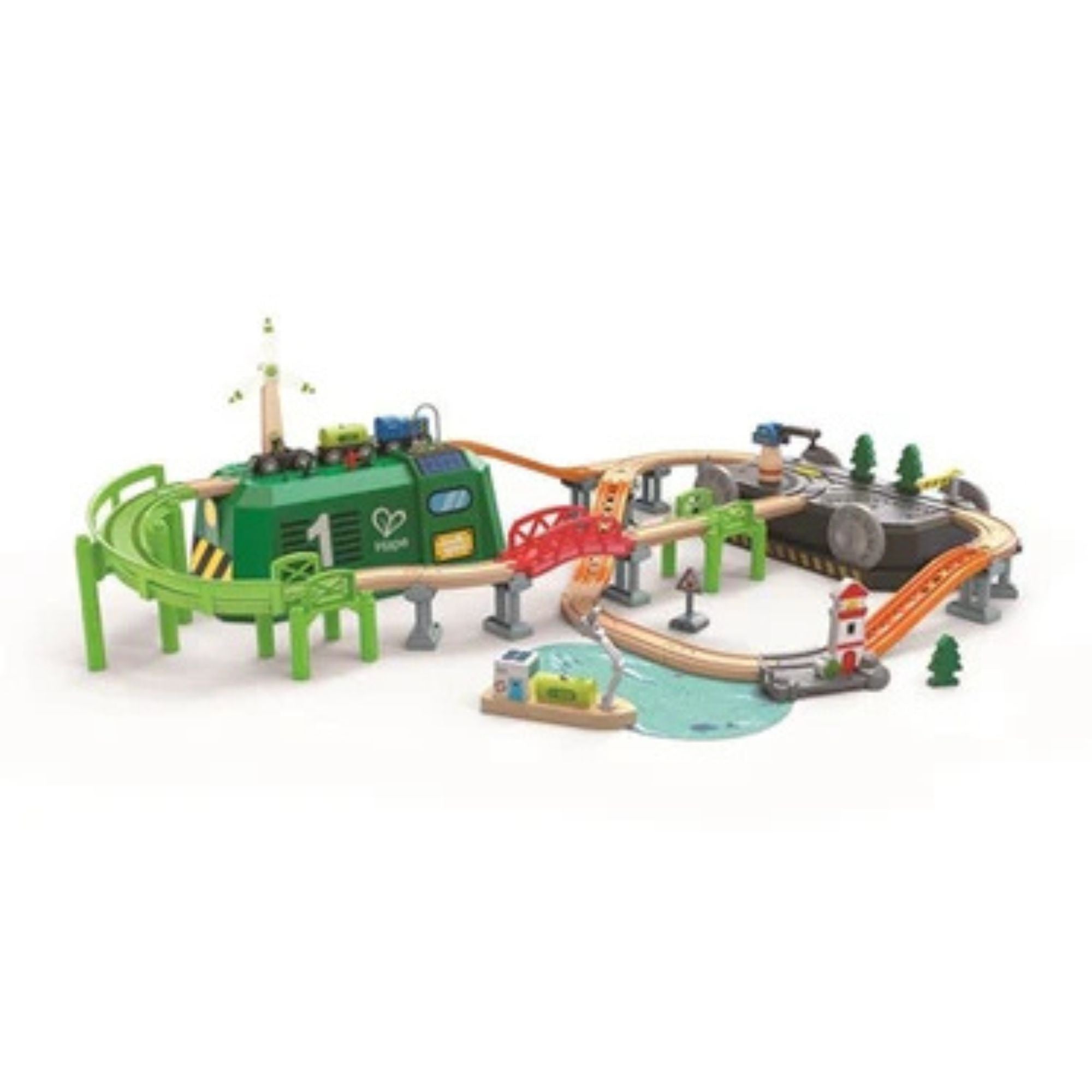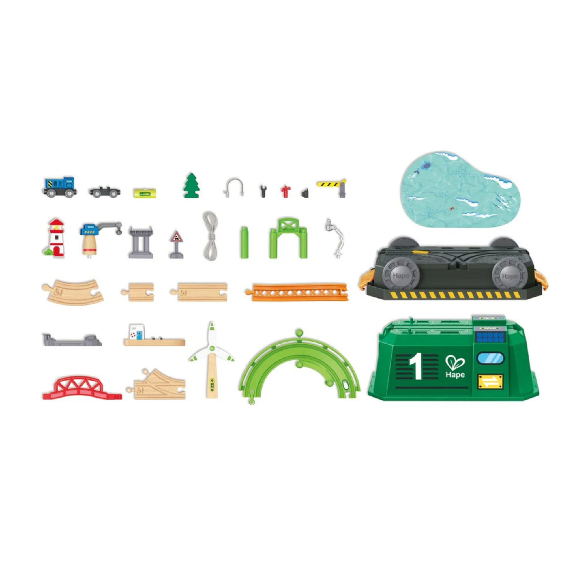 INNOVATIVE TRAIN-SHAPED BOX: This unique train-shaped storage box doubles as a stylish storage solution and a playful addition to the railway scene, capturing the charm of a locomotive in its design.VERSATILE PLAY OPTIONS: Offering numerous play scenarios, this set stimulates childrens imagination. They can operate a crane, transport goods by boat and train, and engage in role-play activities such as charging the train at a pretend solar power station.EASY TO TRANSPORT: Equipped with built-in wheels, the box allows children to move their railway set to different locations effortlessly, promoting an active and spontaneous play experience.nnUNLIMITED COMPATIBILITY: Designed to be compatible with Hapes other railway tracks, this set can be easily integrated and expanded, allowing limitless growth and exploration opportunities.SAFE MATERIALS: Crafted from high-quality, non-toxic materials, this railway set ensures safe, durable playtime for young engineers