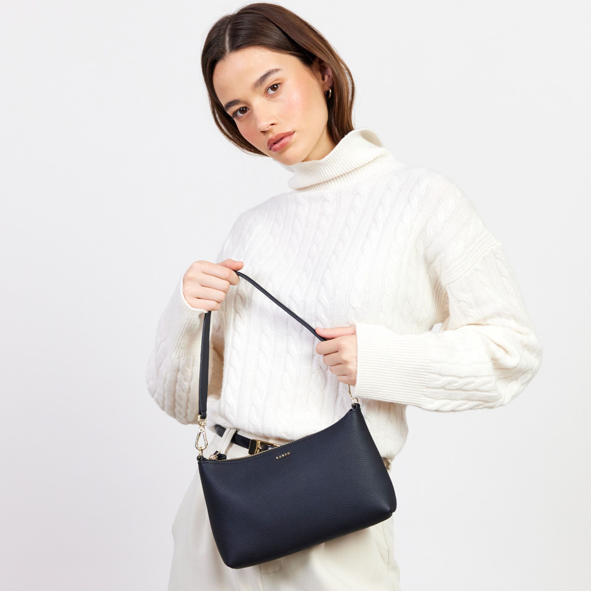Small but mighty. Saben's Haven is your go - to for nights out and weekend brunches — compact enough to keep things simple, roomy enough for everything that matters. S he fits your phone, wallet, and essentials with ease, sitting comfortably under your arm whil e you enjoy the moment. Swap between the shoulder and crossbody straps depending on your vibe, and rely on the internal zip pocket and key clip to keep your valuables secure.