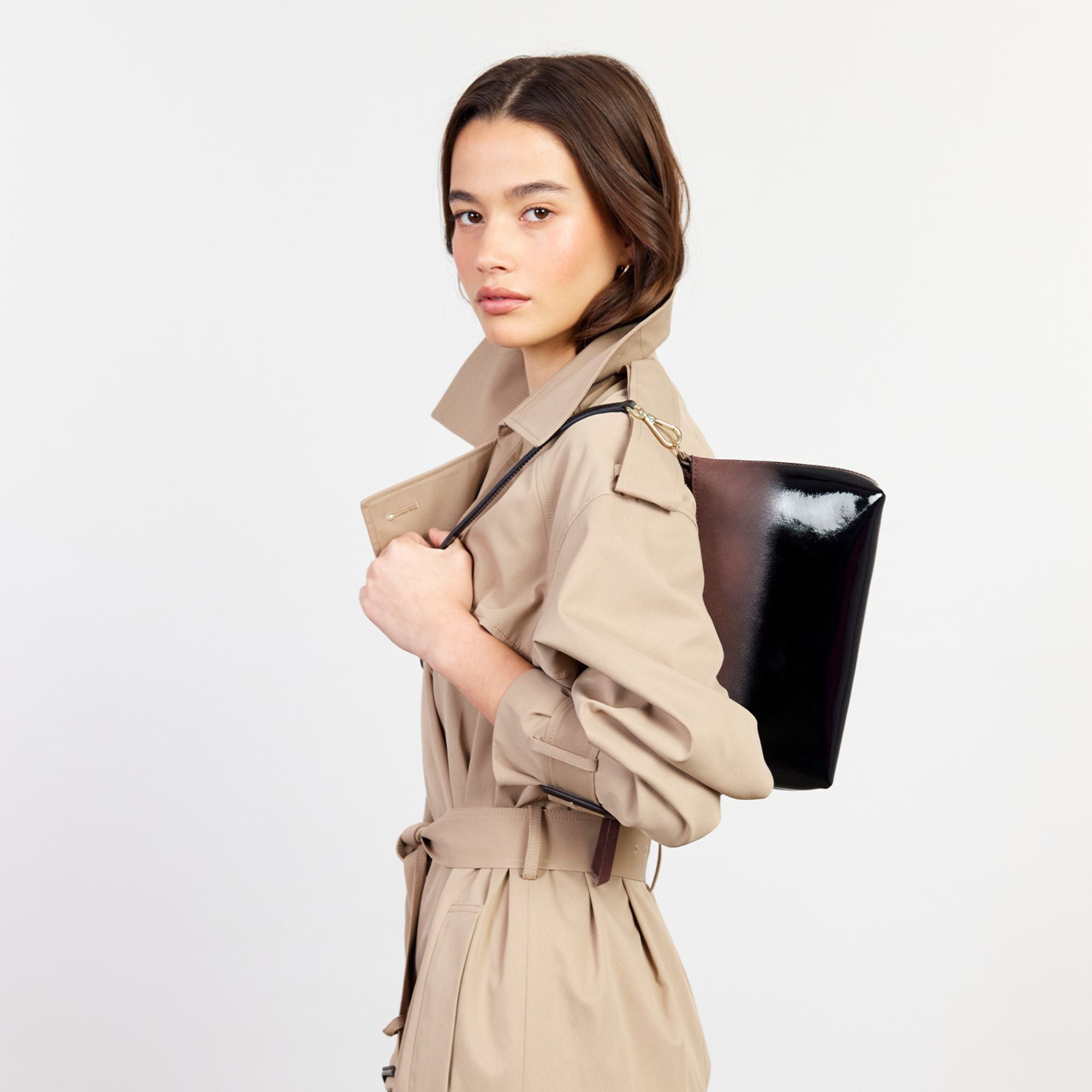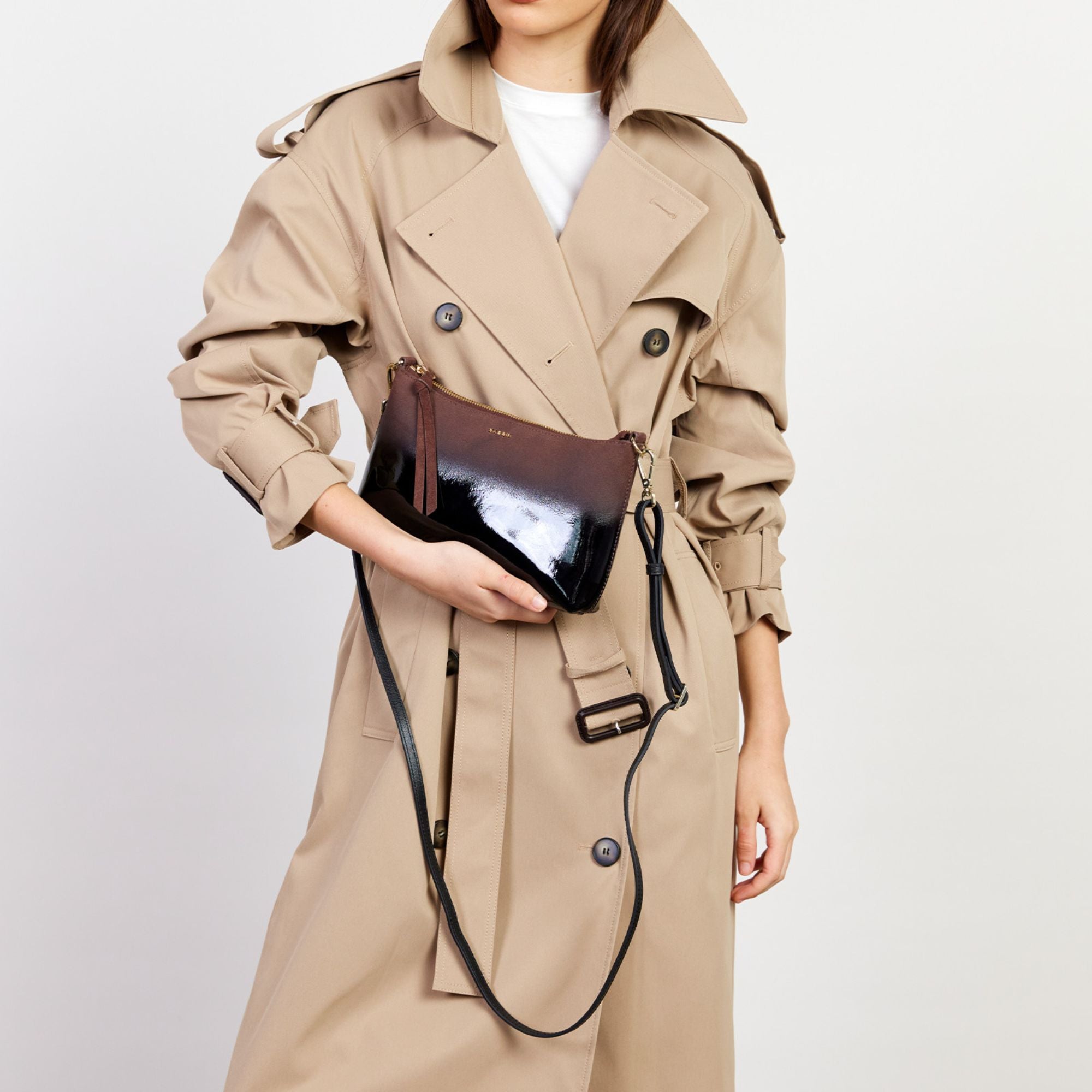 The unique dipped leather showcases a stunning ombré effect — soft suede gradually transitioning into a glossy, patent - like fi nish that catches the light beautifully. She is perfectly sized to fit your phone, wallet, and a few small essentials without the bulk. The slim silhouette sits comfortably under your arm, keeping you hands - free and effortlessly chic whether you're out fo r cocktails or catching up with friends.