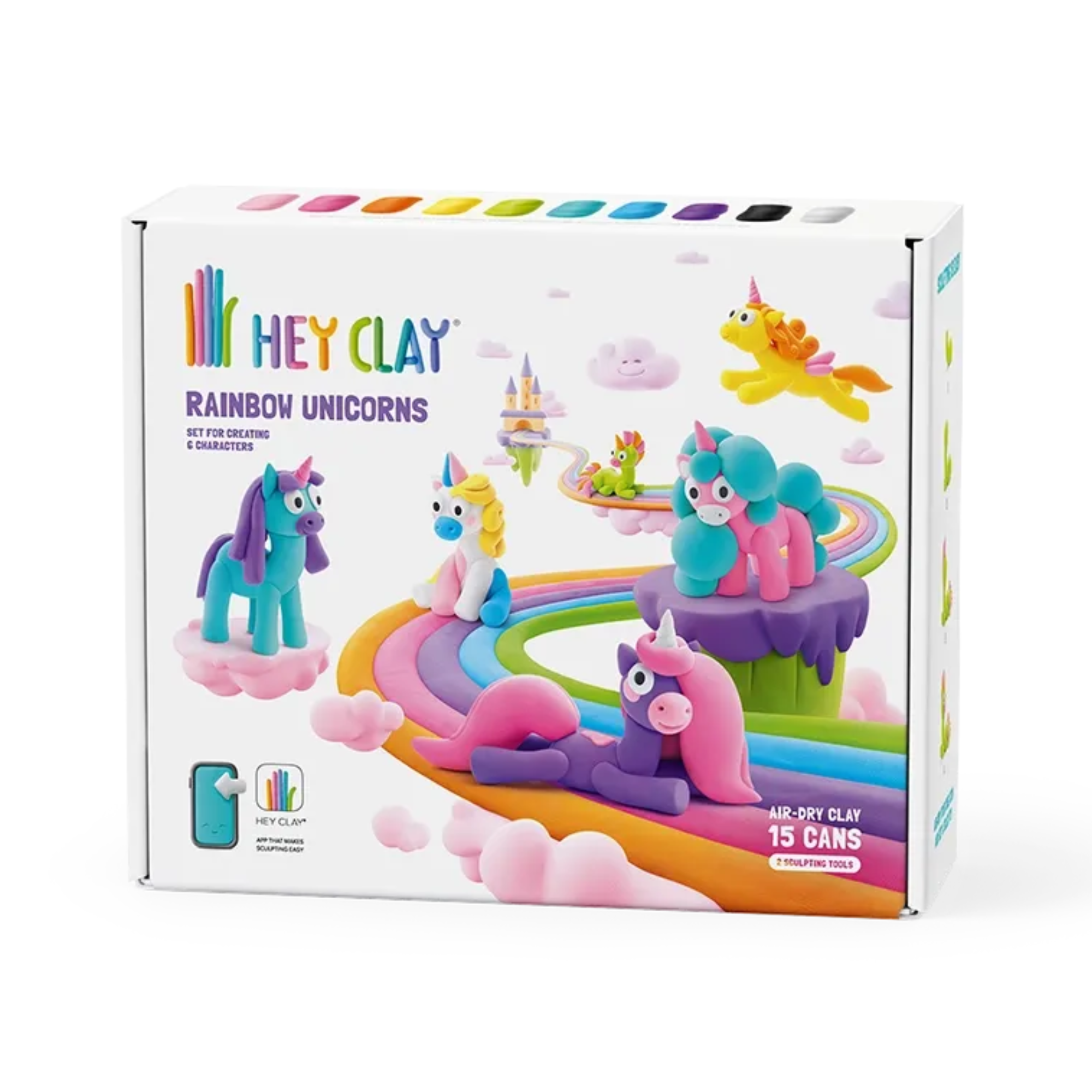 Introducing a fun adventure with RAINBOW UNICORNS from Hey Clay! These magical creatures invite you on an exciting journey through rainbow clouds! Create your own stories and have fun with 6 cute Rainbow Unicorns in the world of your fantasy.