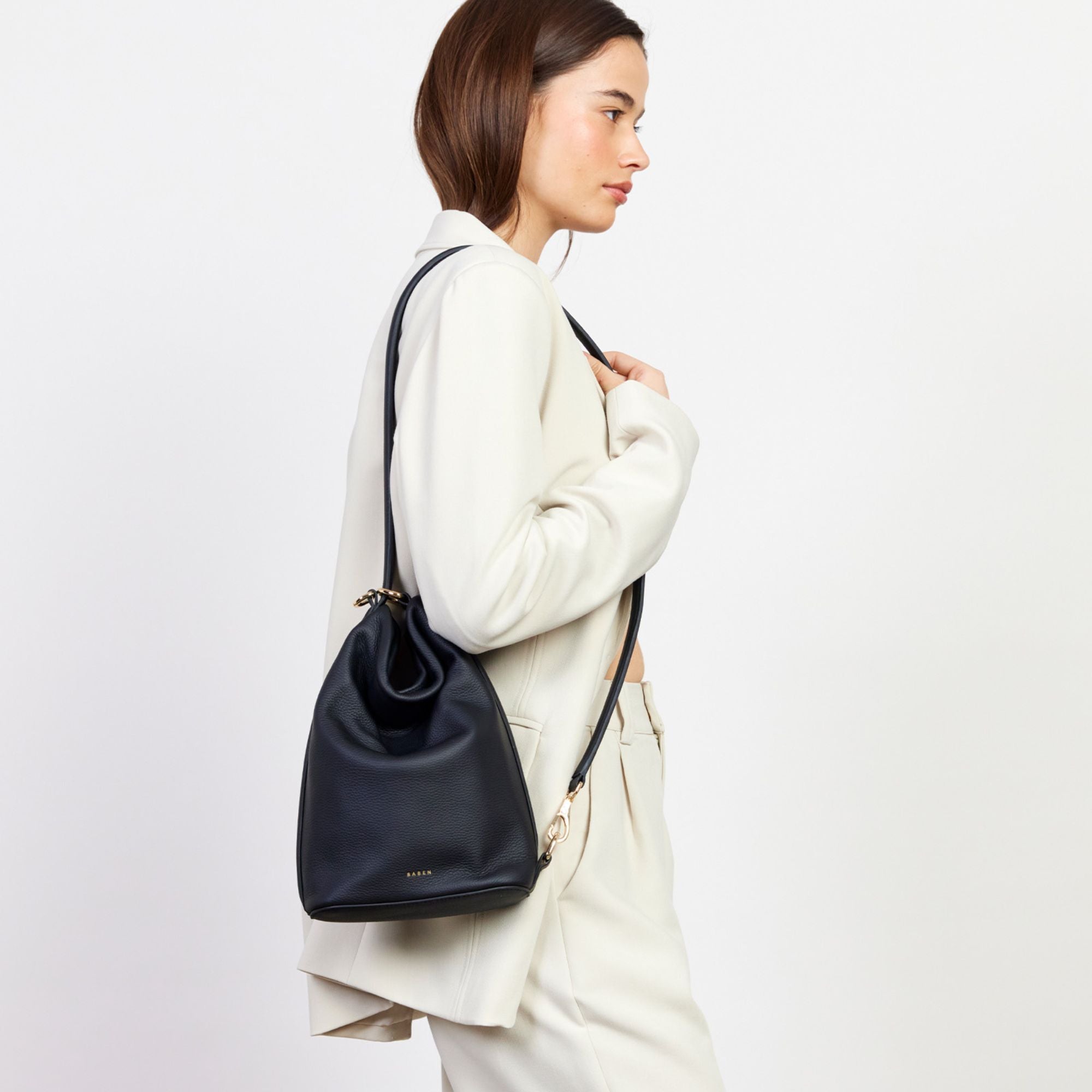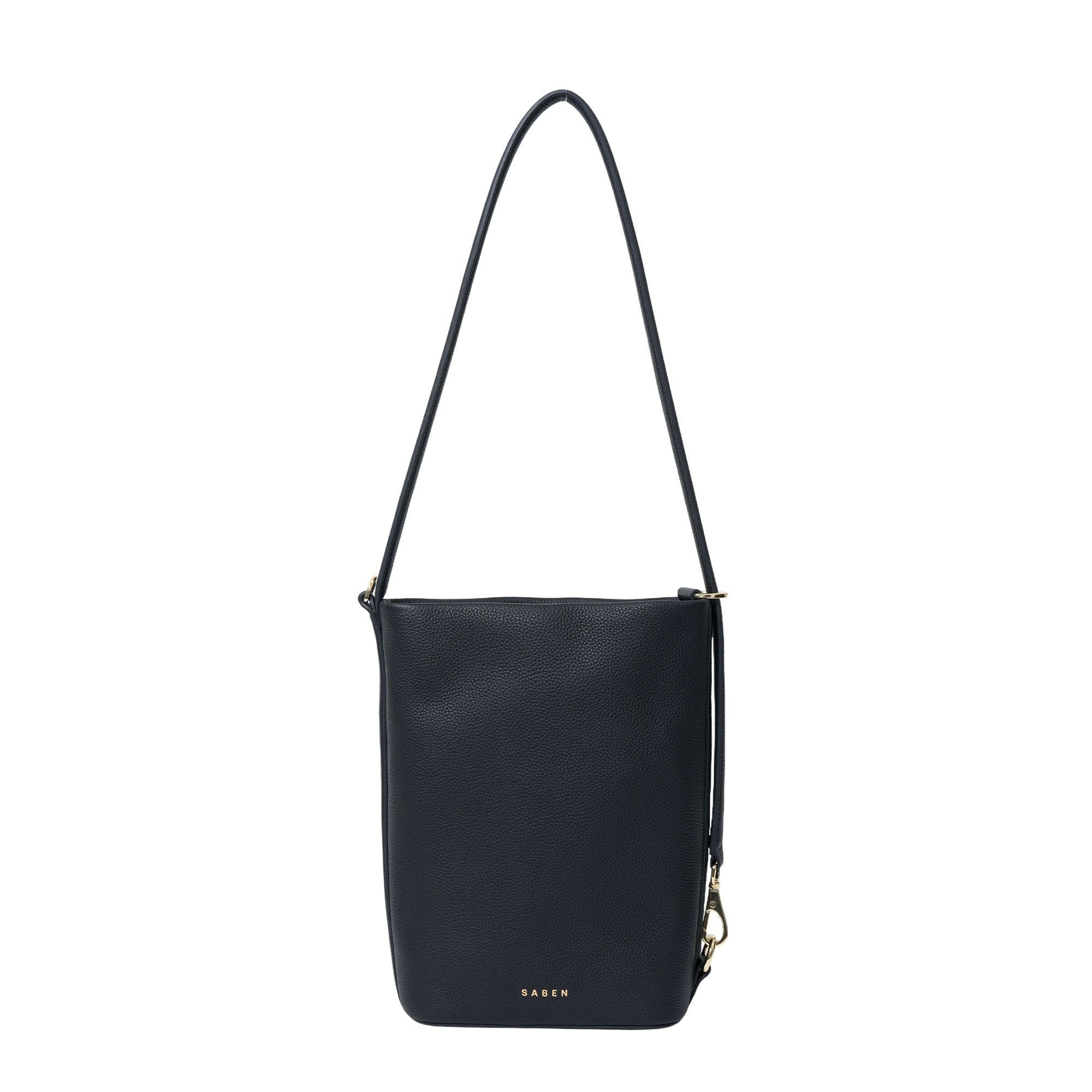 A sleek mid-sized bucket style bag by Saben; the smaller sister to our generous bucket tote June. Jojo delivers the same sophisticated functionality in a more compact form. Perfect for those who prefer to carry with intention rather than excess, while maintaining the effortless style transition from shoulder to crossbody wear. Simply unclip the signature SABEN hardware to transform it into a chic crossbody – versatility refined