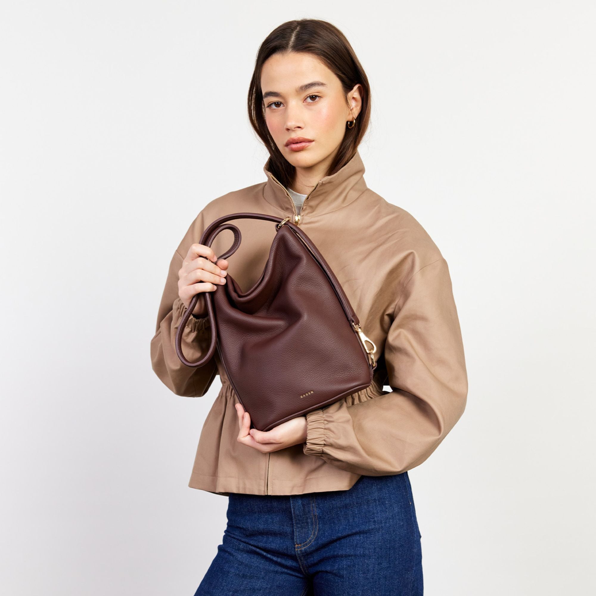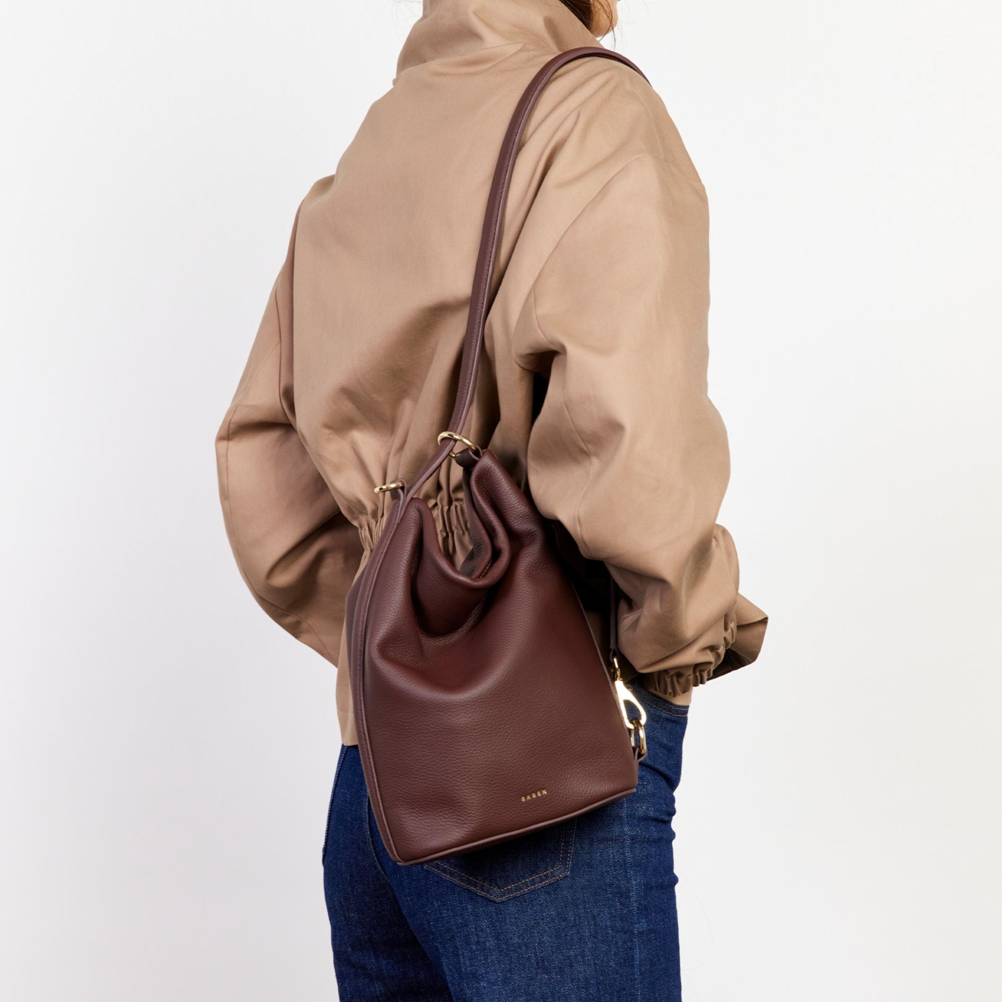 A sleek mid-sized bucket style bag by Saben; the smaller sister to our generous bucket tote June. Jojo delivers the same sophisticated functionality in a more compact form. Perfect for those who prefer to carry with intention rather than excess, while maintaining the effortless style transition from shoulder to crossbody wear. Simply unclip the signature SABEN hardware to transform it into a chic crossbody – versatility refined