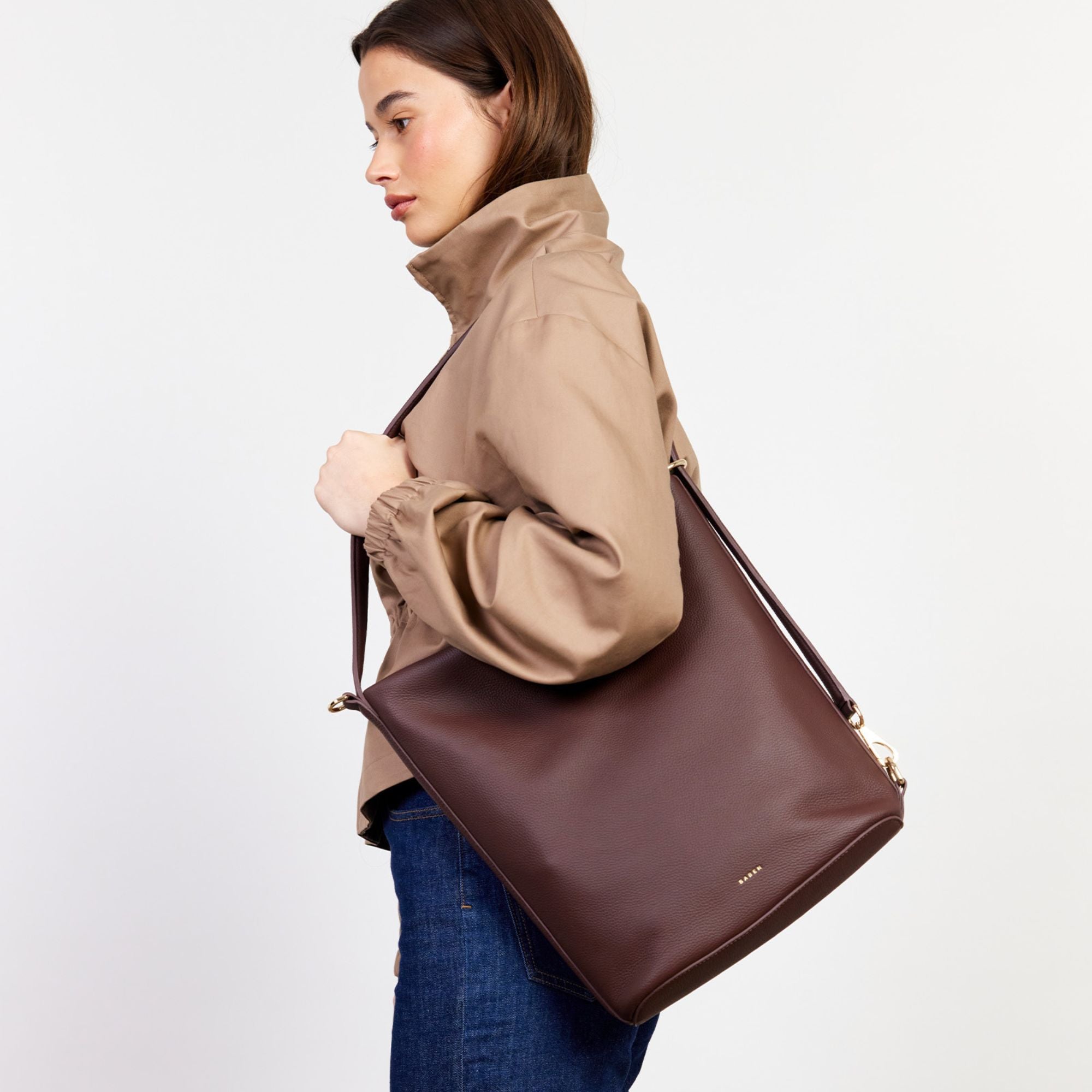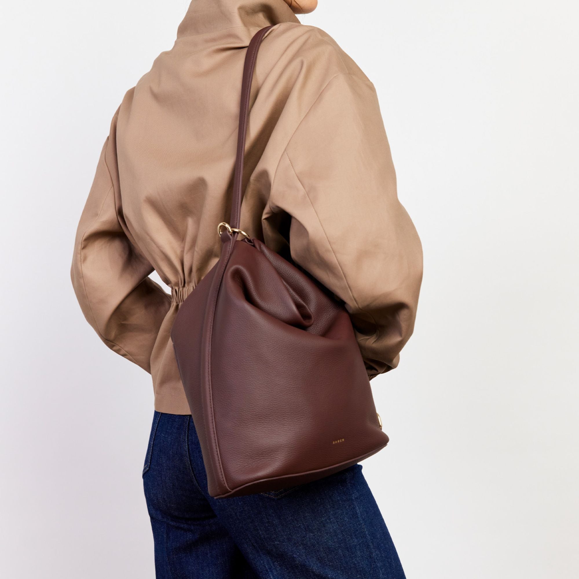 A chic bucket style tote by Saben designed for your everyday needs. June’s sleek, adjustable shoulder strap and a secure magnetic closure provides generous space for all your essentials – and then some. Simply unclip the statement SABEN hardware to extend the bag to a set length crossbody.