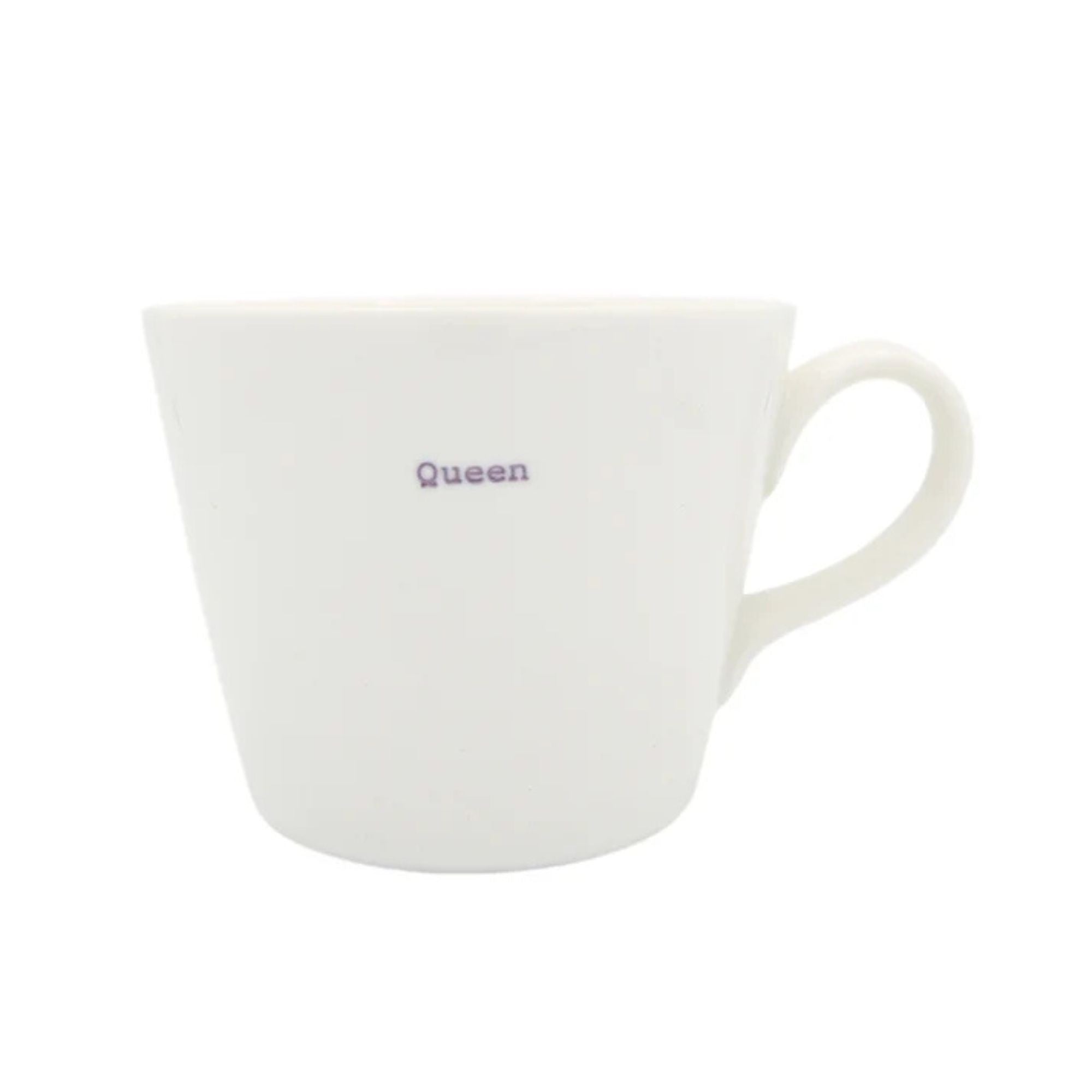 This 'Queen' Keith Brymer Jones bucket mug would make a wonderful gift! Made from dishwasher and microwave safe super white porcelain. 350mL, 8cmH x 10cmW x 12.5cmL