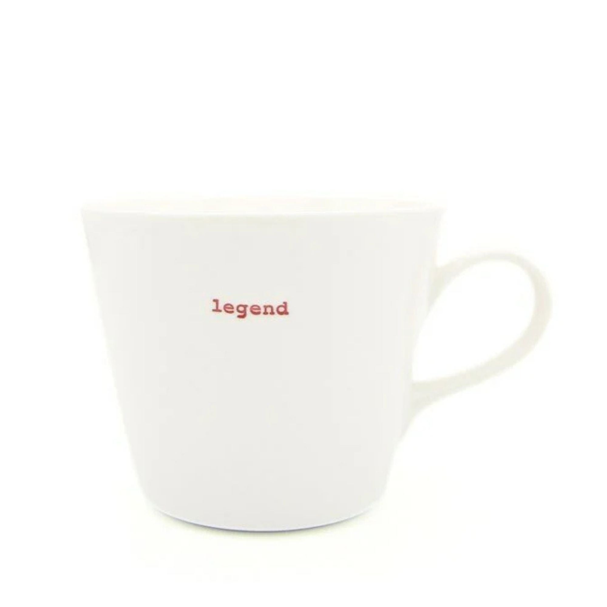 Remind a loved one just how amazing they are and serve up their favourite brew in this large Keith Brymer Jones bucket mug hand stamped with ‘legend’ in red typewriter font.