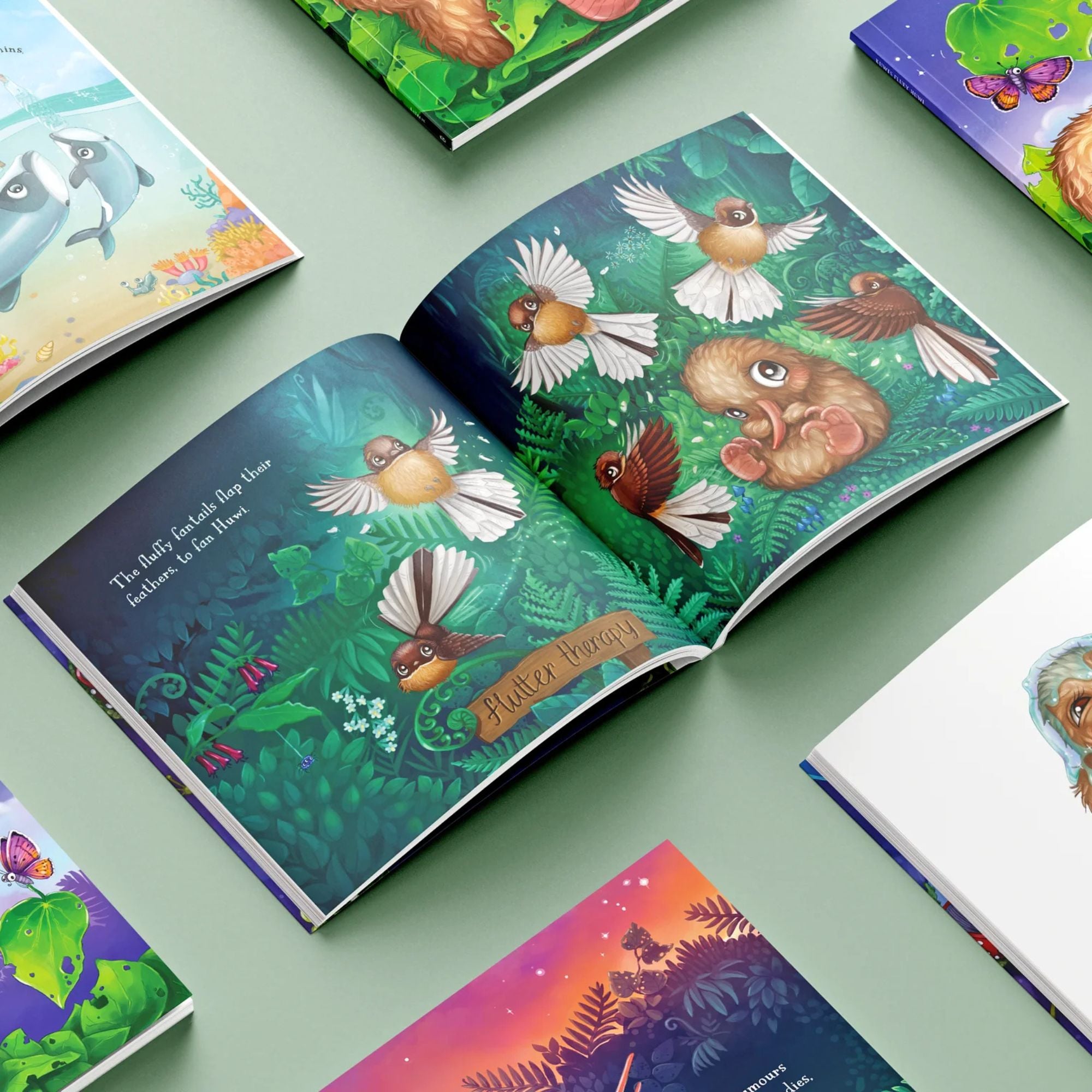 Kuwi tests... Glittering goo made from glow worm poo, but Huwi’s sniffles stubbornly stay. A raw claw concoction made by a tatty tuatara, but Huwi’s chill still stays. Flutter therapy offered by a friendly fantail whānau, but Huwi’s sniffles peskily persist!