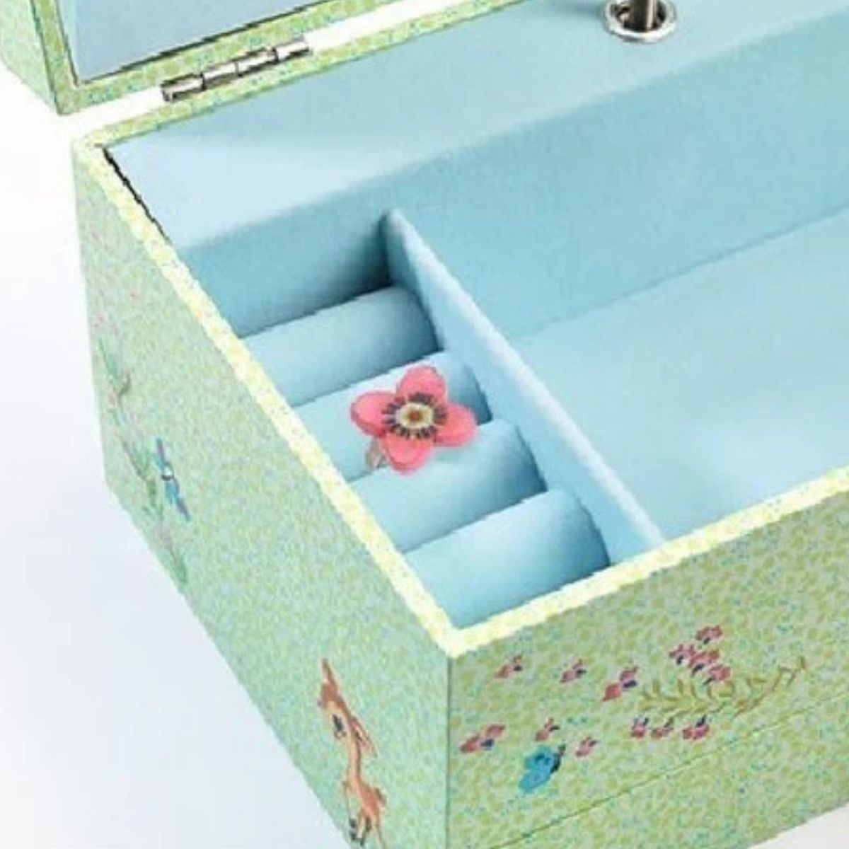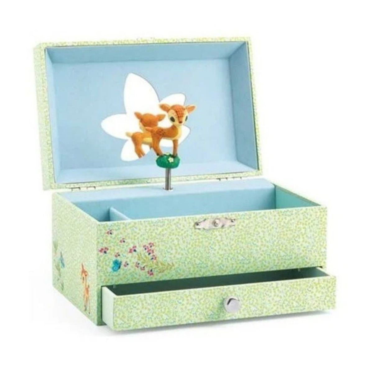 Children will love to listen and watch the fawn spin whilst having a perfect box for storing all sorts of trinkets. Featuring a spot for rings and a pull out drawer for storing extra special treasures.