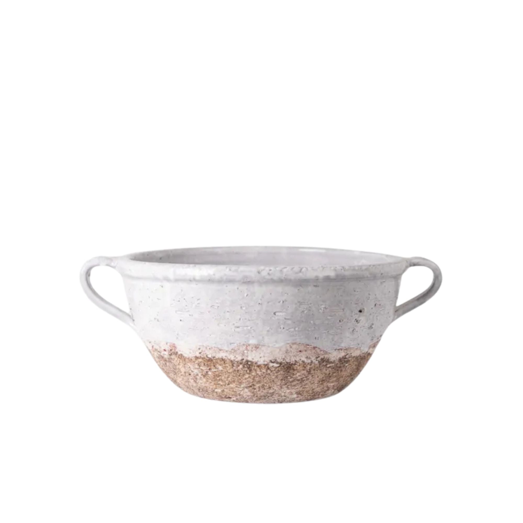 This low, wide bowl pairs a matte glaze with raw terracotta texture by French Country, creating a beautiful contrast between refinement and earthiness. The hand-finished surface mimics the look of stone worn smooth by time – softly imperfect and full of character. Use for styling dried botanicals, fruit, or as a standalone piece. Designed to coordinate with other shapes in the Pebbles and Glacier collection for a harmonious, sculptural look.