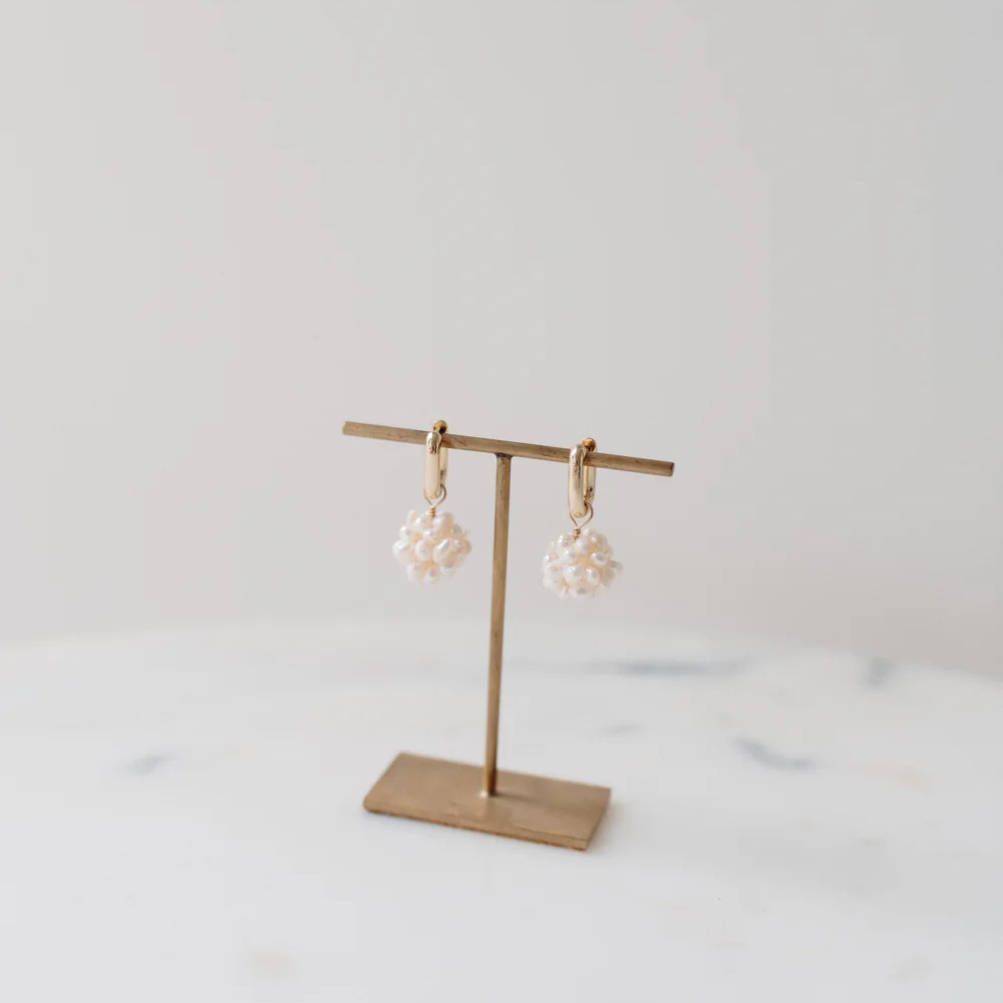 A pearl ball cluster on a yellow gold plated rectangular hoop from Peggy & Twig.