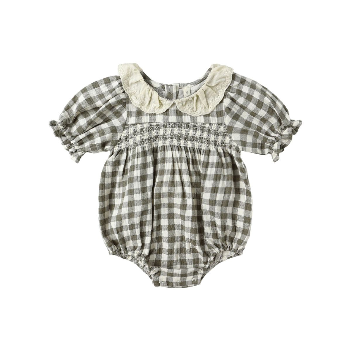 Our Callie Romper features a sweet embroidered collar, smocked front, and gathered short sleeves. Buttons at the back and snaps at the bottom make for easy dressing.