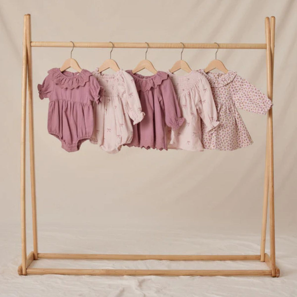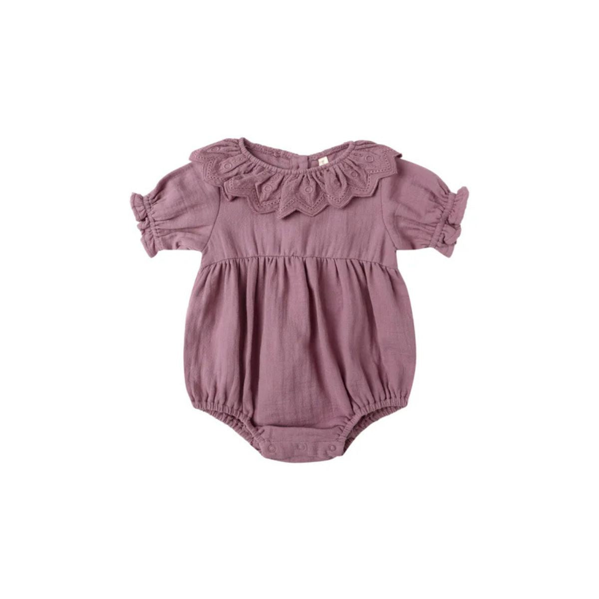 A sweet romper with a collar, short puff sleeves, and ruffle details, finished with back buttons and bottom snaps for easy changing.