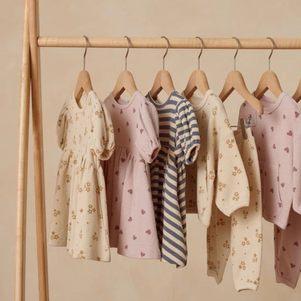 Our waffle knit Darla Dress features a babydoll silhouette with an empire waist, balloon sleeves, and a coconut button keyhole at the back. Coordinating bloomers included with all sizes.