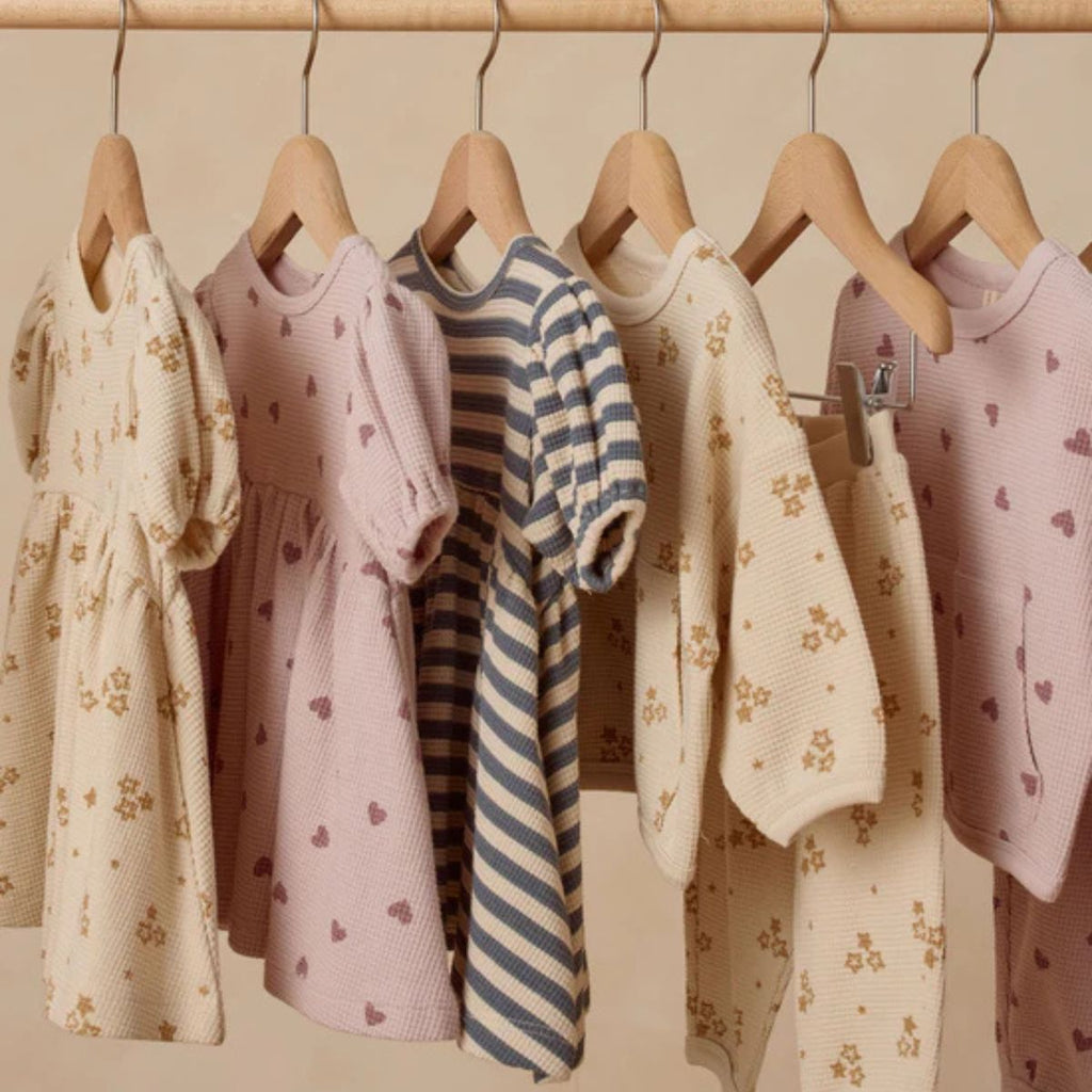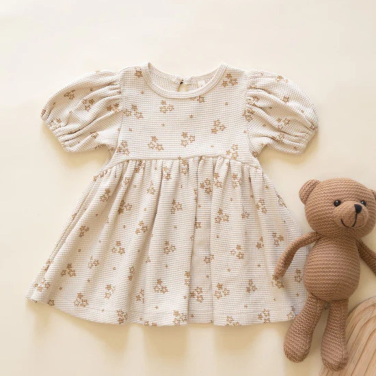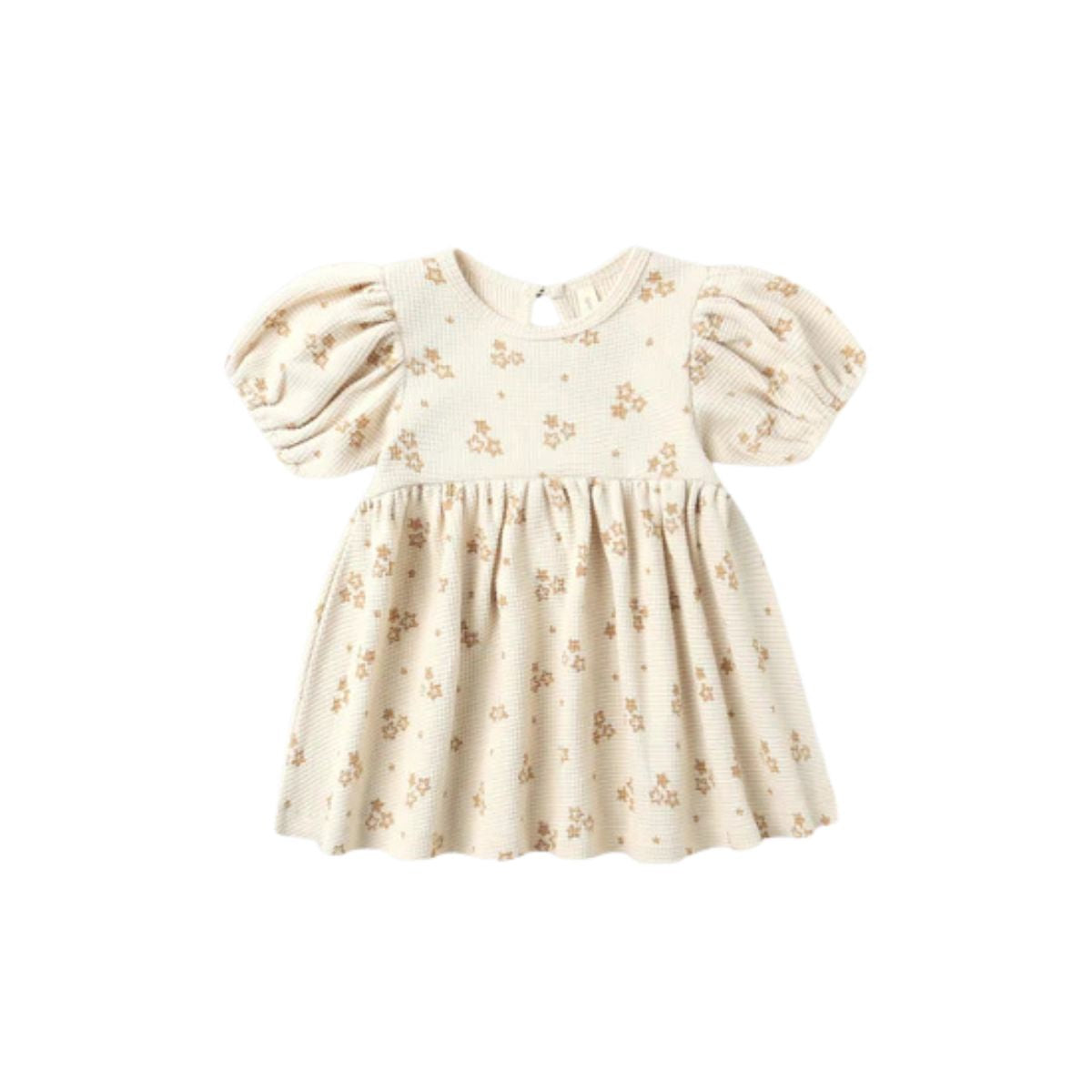 Our waffle knit Darla Dress features a babydoll silhouette with an empire waist, balloon sleeves, and a coconut button keyhole at the back. Coordinating bloomers included with all sizes.
