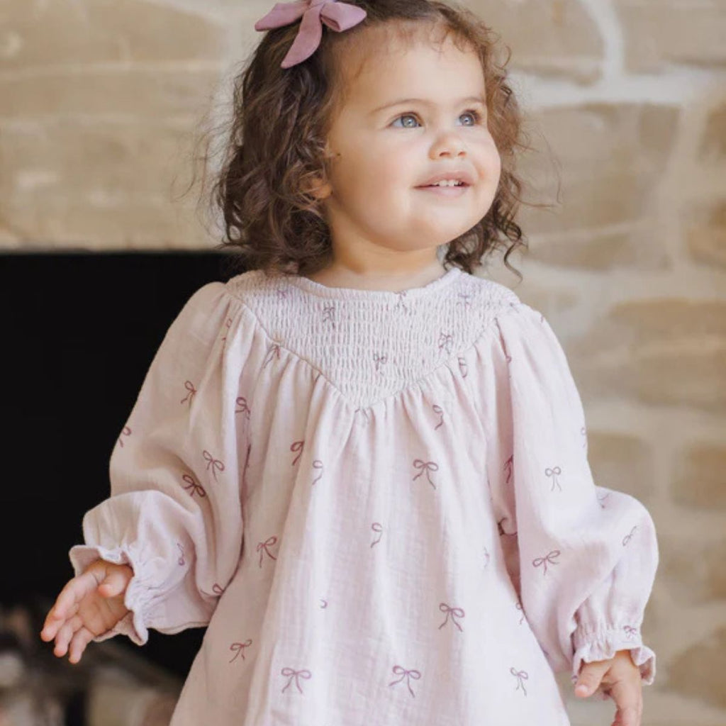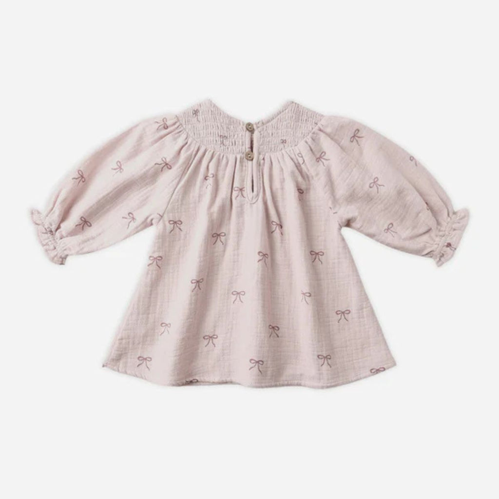 This sweet long sleeve dress features a v-shaped smocked neckline, ruffle sleeves, and a button back closure for easy changes. Coordinating bloomers included with all sizes.