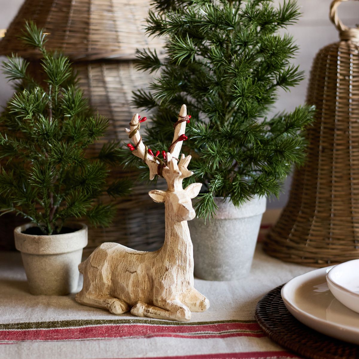 This sleepy Scandi Deer is all snuggled up and ready to join your Christmas decorations! With its cute carved texture, soft beige tone, and red bead antlers, it’s the perfect addition to your holiday home décor for a touch of cosy Nordic style.