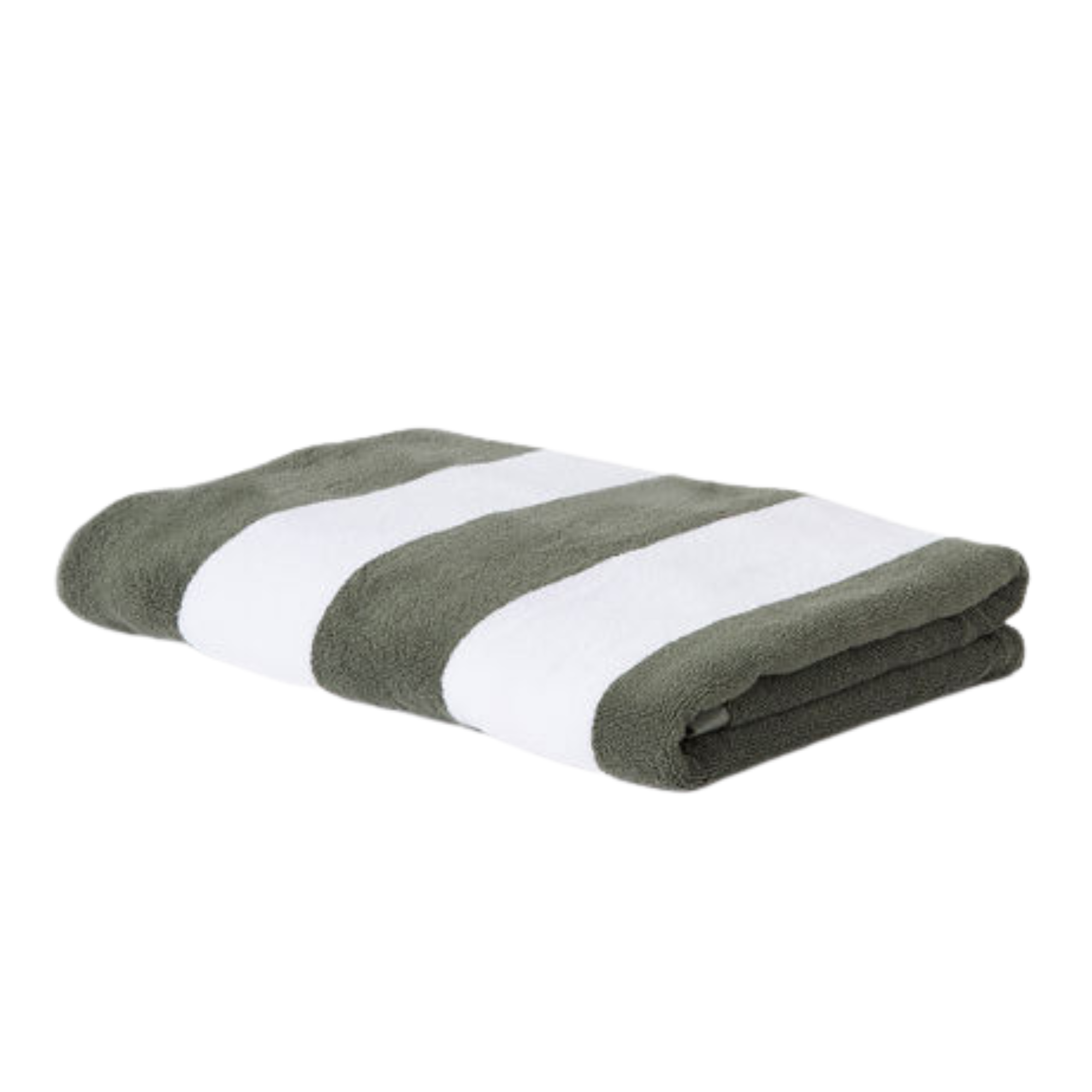 This lovely, large olive stripe beach towel is a summer must-have! Perfect for lounging by the pool or hanging out at the beach. Made from 100% cotton, designed in New Zealand and 90cm x 170cm