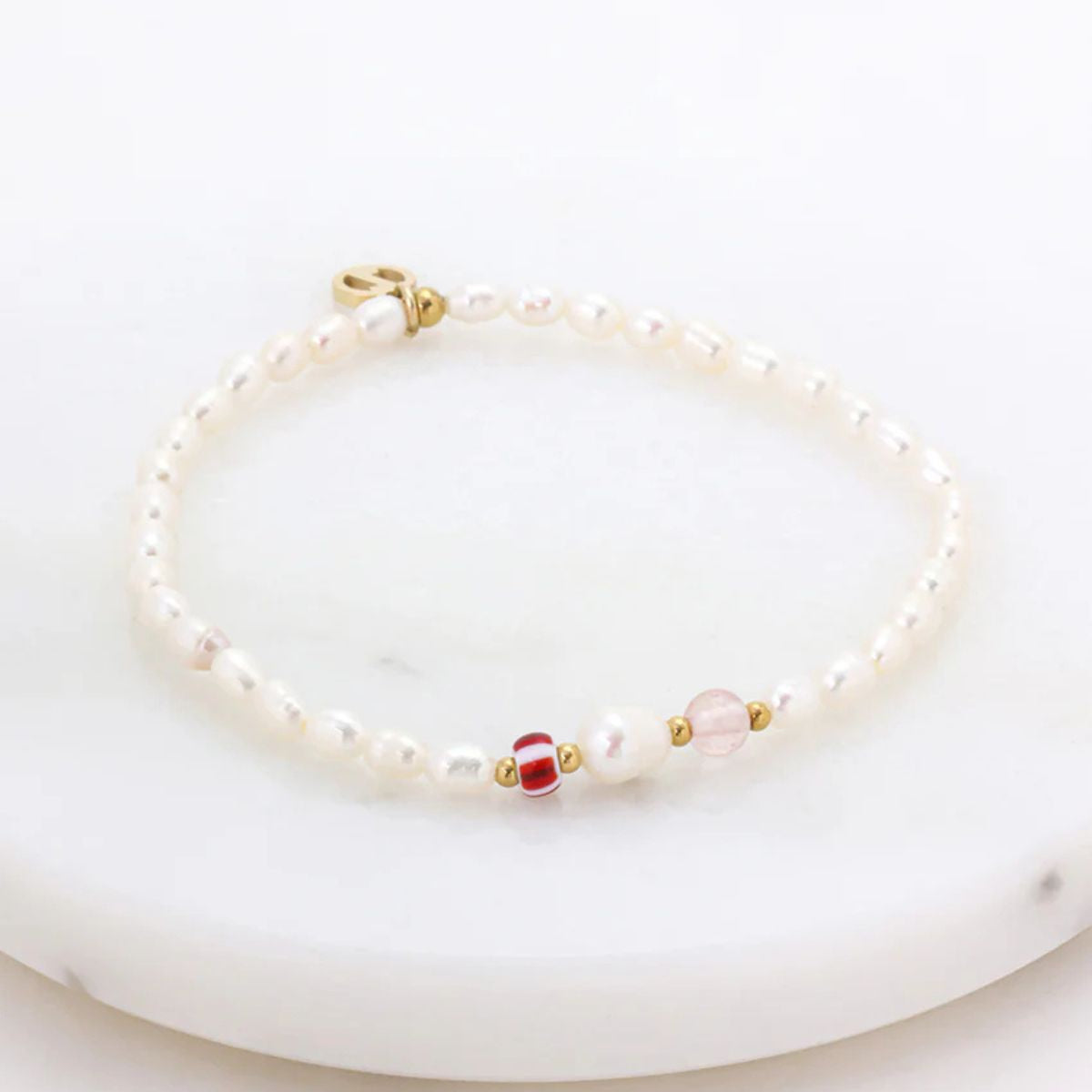 The Amber Bracelet combines timeless elegance with a modern twist. Featuring delicate freshwater pearls, a soft pink stone, and a bold red enamel bead, this piece is finished with fine gold accents for a touch of warmth. Designed to be worn solo or layered, it’s the perfect everyday statement.