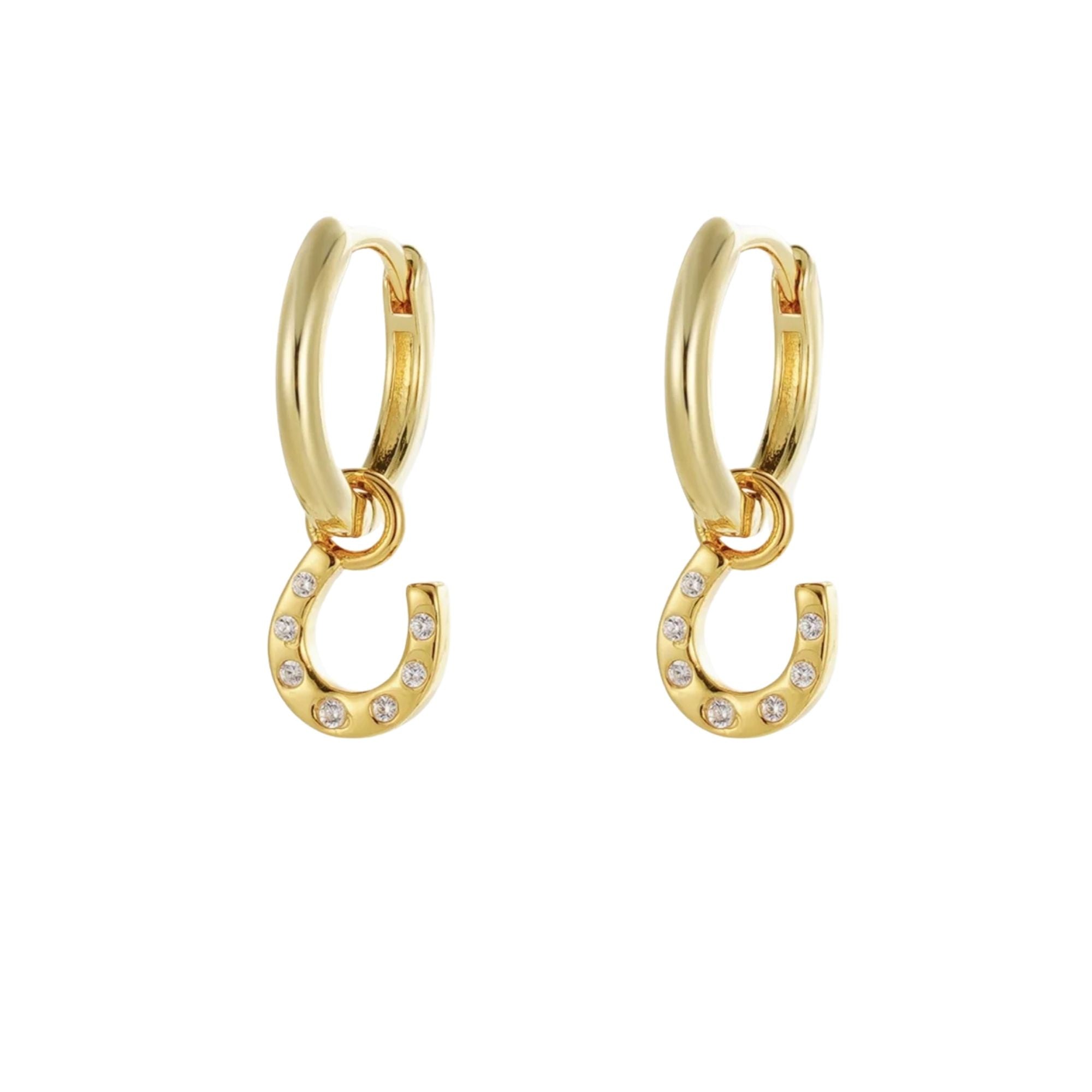 Gold hoop Zafino earrings with a pavé horseshoe charm—designed to add a playful touch and subtle sparkle to everyday styling, whether worn alone or paired with other earrings for a layered look.